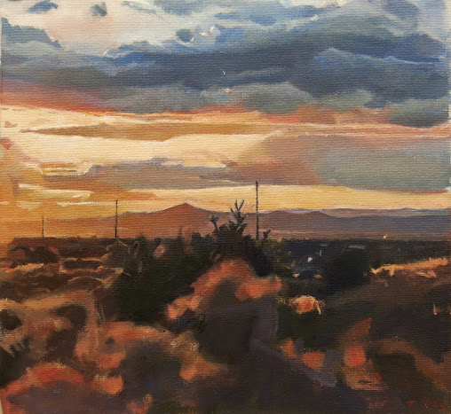 I painted this New Mexico sunset scene using a split complementary palette of Ultramarine Blue, yellow- orange (a mix of Cadmium Yellow and Cadmium Orange) and red-orange (a mix of Cadmium Orange and Cadmium Red). These three piles of paint plus white kept my focus on the balance of warm and cool rather than trying to copy the colors exactly. It was fun and I'm already thinking of trying other split-complementary palettes!